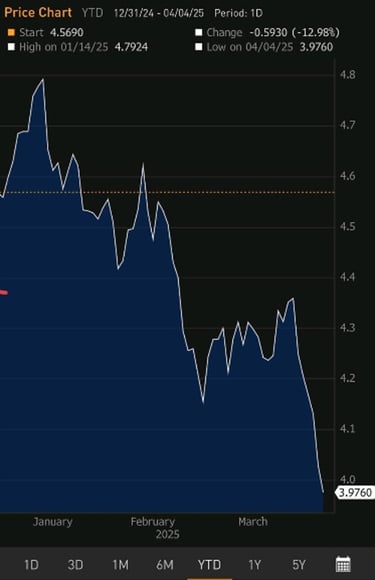 This decline came after the US announced new import tariffs, which raised fears of a global recession and pushed investors towards assets considered safer, such as US government bonds. As a result, demand for these securities increased, causing yields to fall. (see chart)